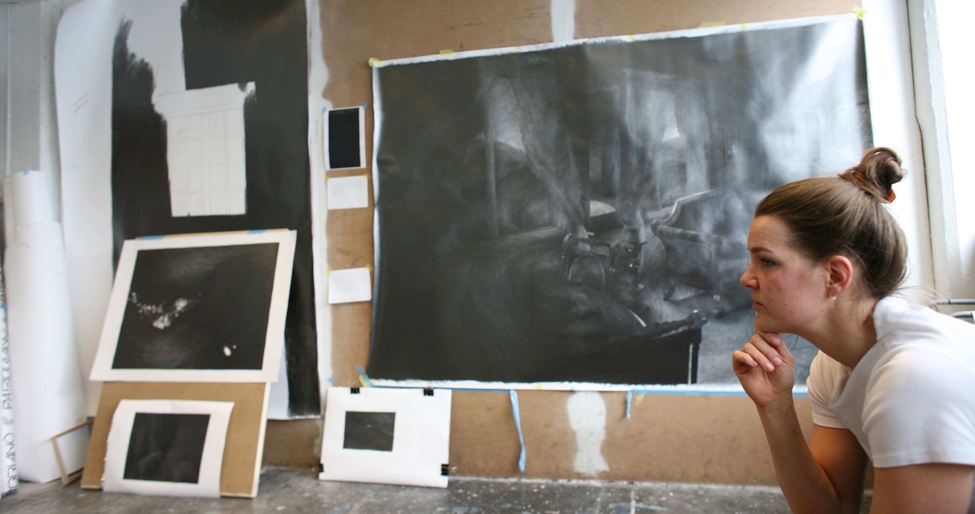 Jeg er opptatt av at alt i tegningen beskrives med samme overflate, om det så er skygger eller tekstiler eller naturelementer. Jeg liker ikke ubehandlede flater, og er opptatt av at også de partiene i tegningene som oppleves som helt sorte skal ha en tekstur eller angi en retning eller bevegelse.
