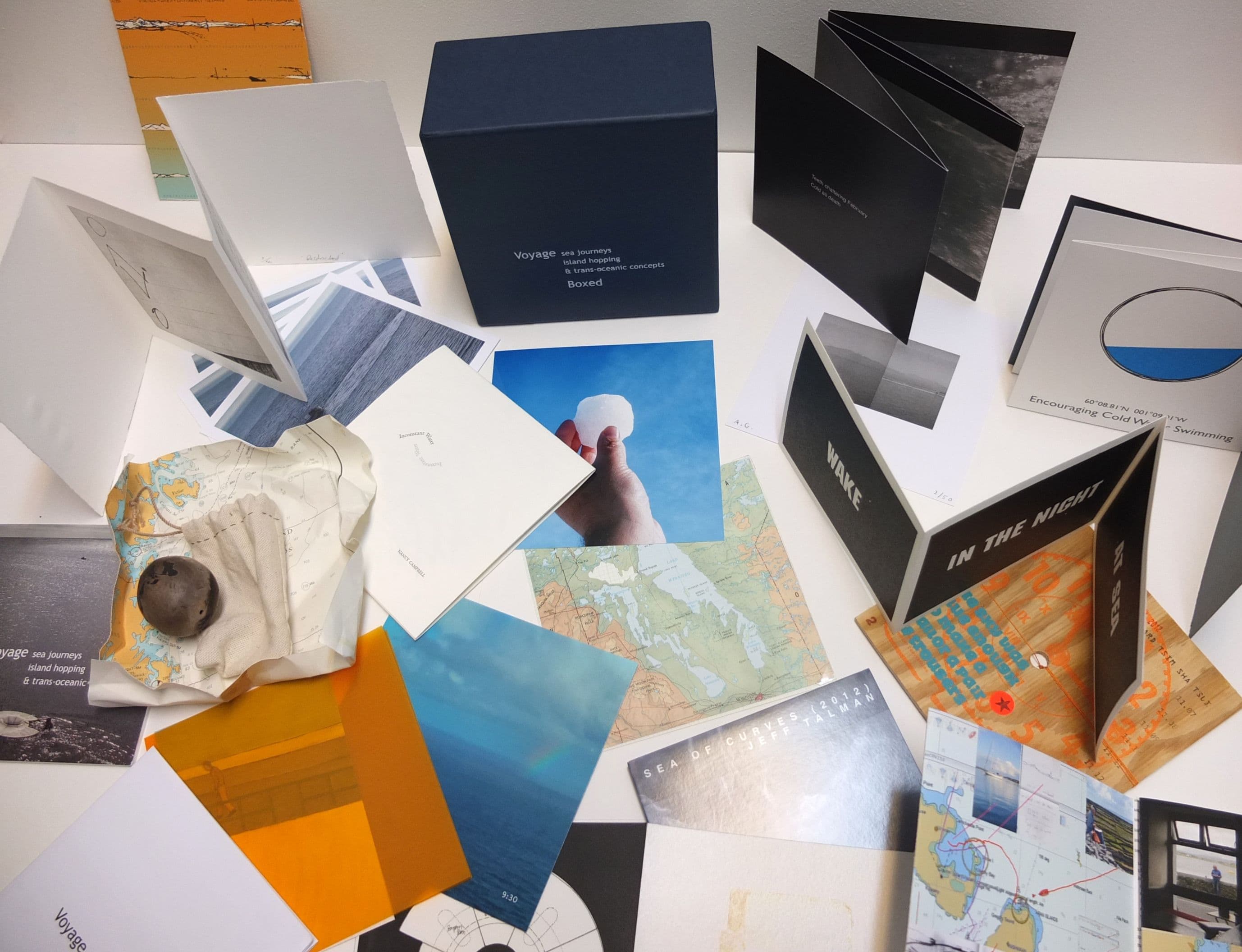 Imi jobber primært med kunstnerbøker. På bildet ser du verket Voyage: BOXED og er et resultat av en utstilling Maufe kuraterte; Voyage: Sea Journeys, Island hopping and trans-oceanic concepts på Dortmund Kunstlerhaus i 2013. Esken inneholder kunstarbeider fra 18 kunstnere som var tilknyttet til prosjektet.
