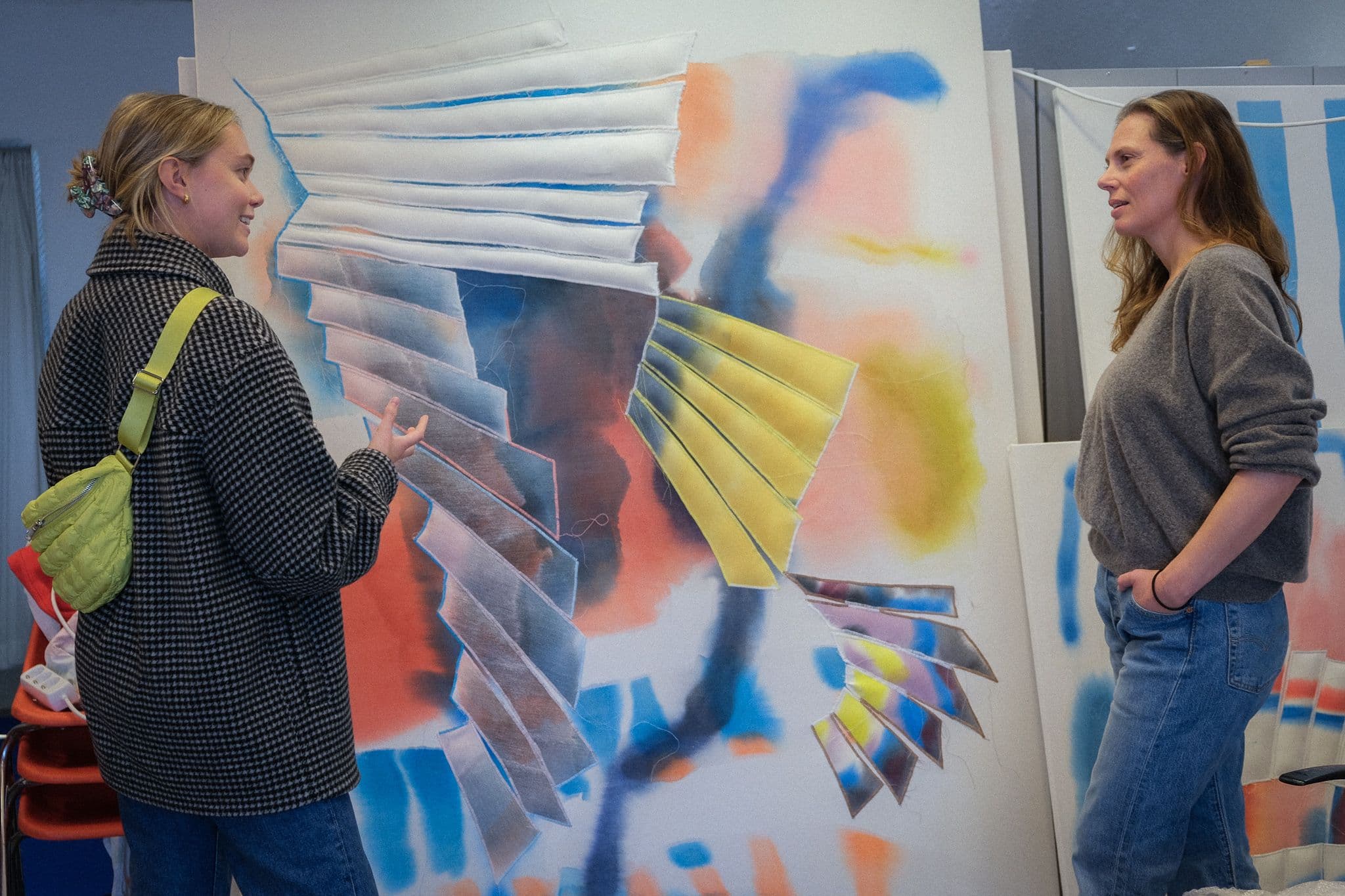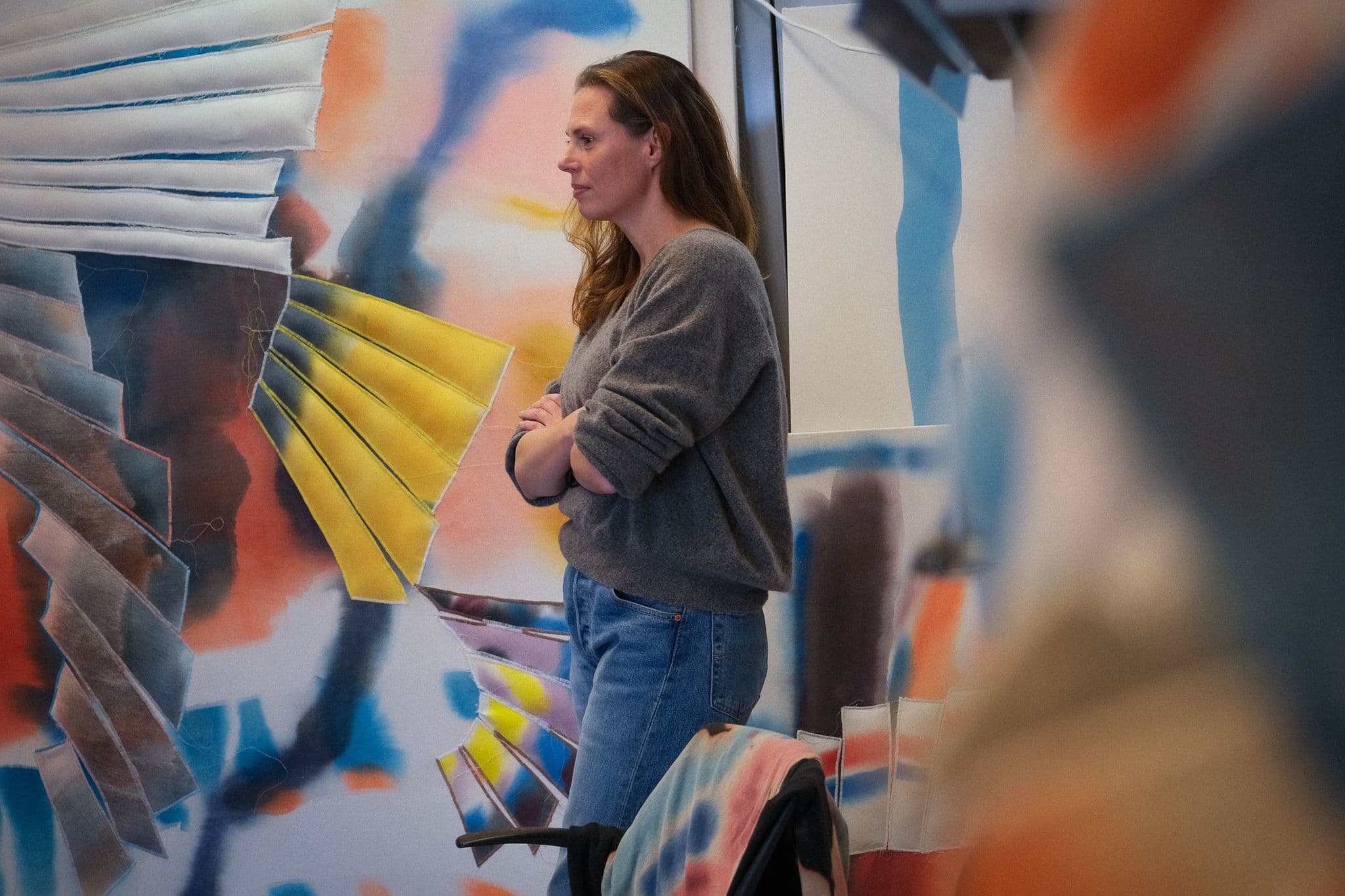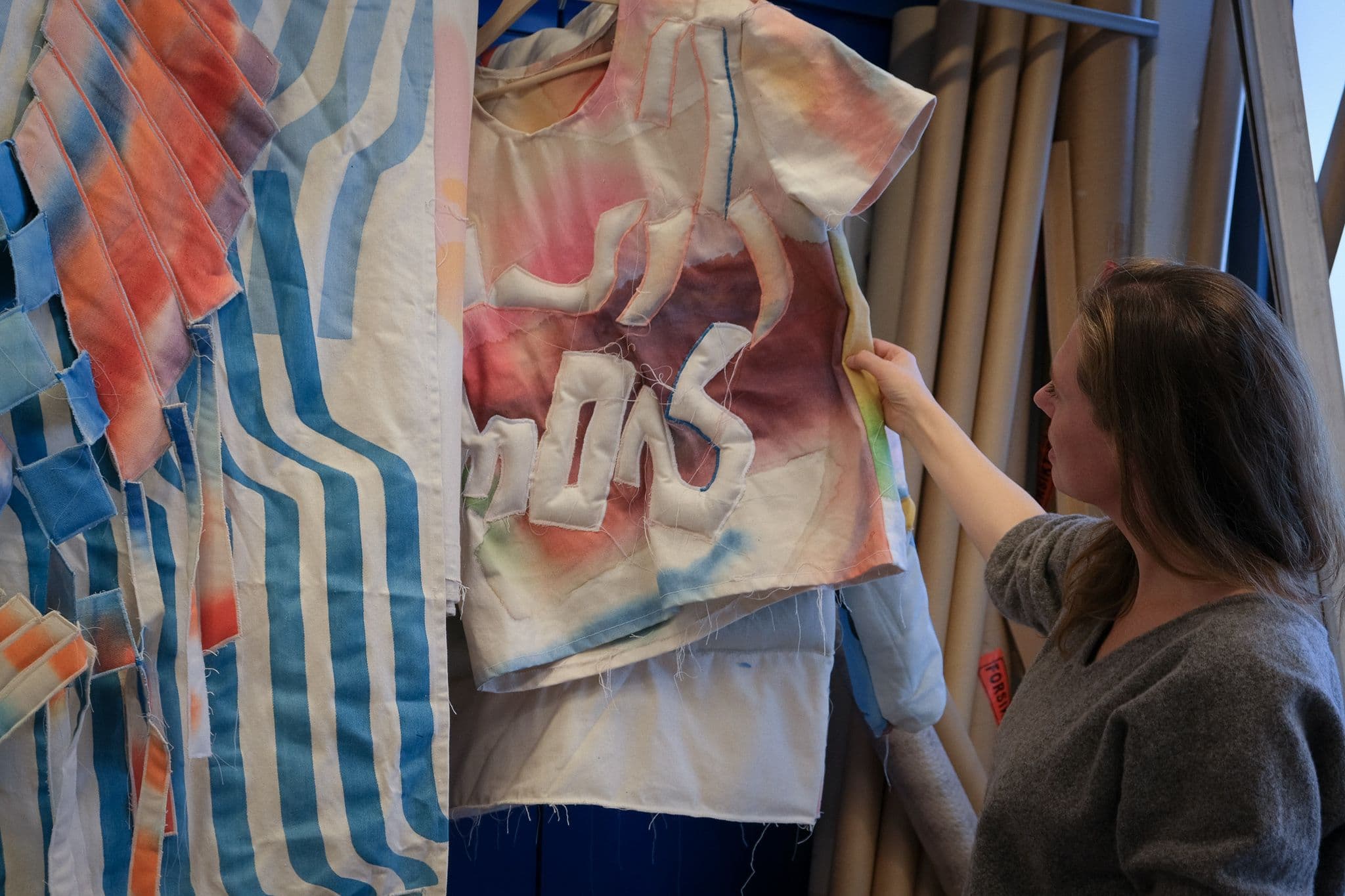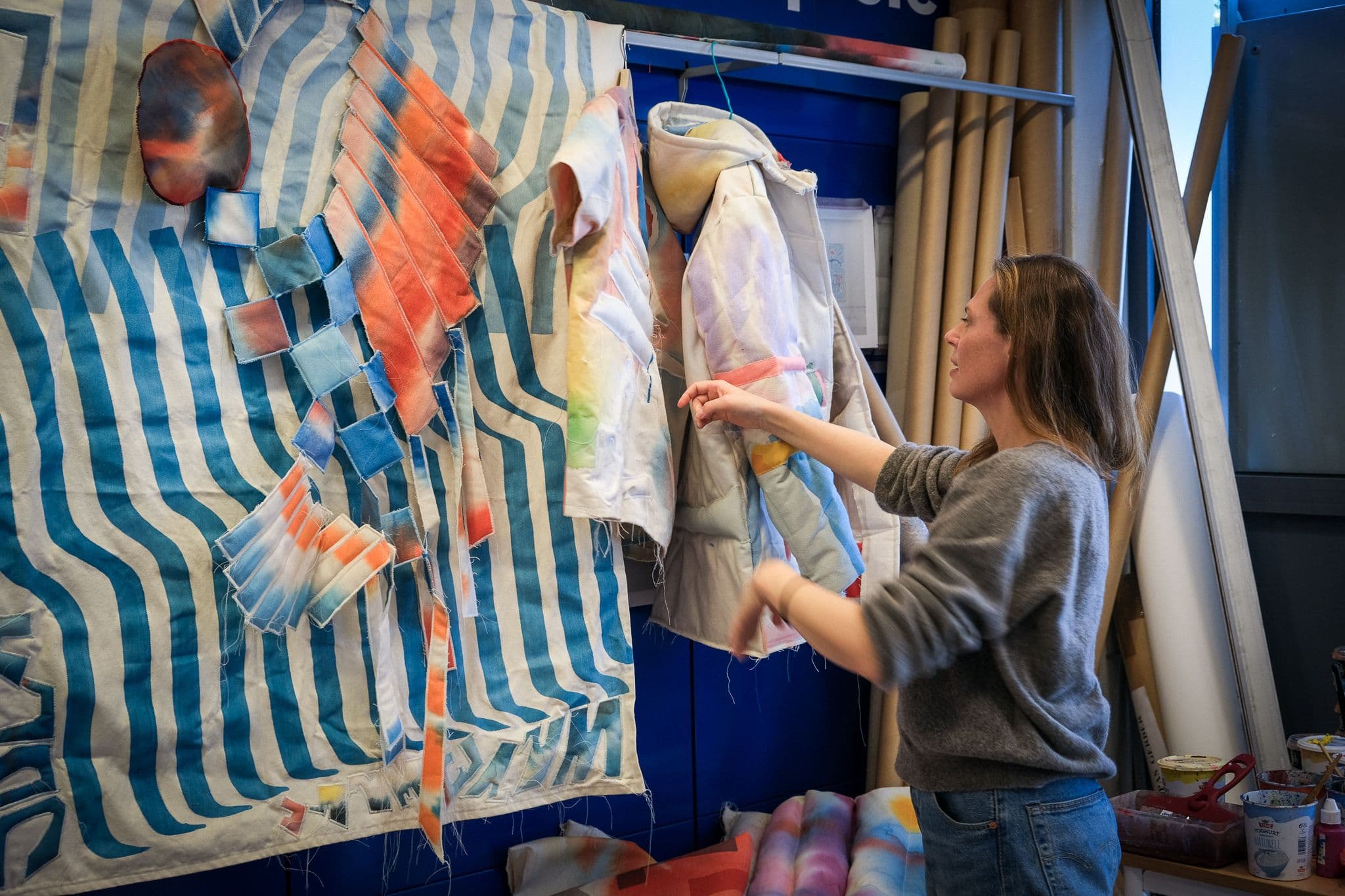 Jakken som er en slags forlengelse av Tandrevold Eriksens malerier, henger ved siden av flere påbegynte tekstilstykker av brukte lerreter som hun trekker fram for å vise.