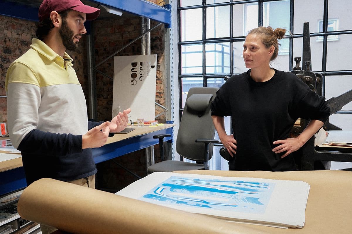 Ruben Hojem og Liv Tandrevold Eriksen på Fellesverkstedet hvor silketrykket har blitt produsert.