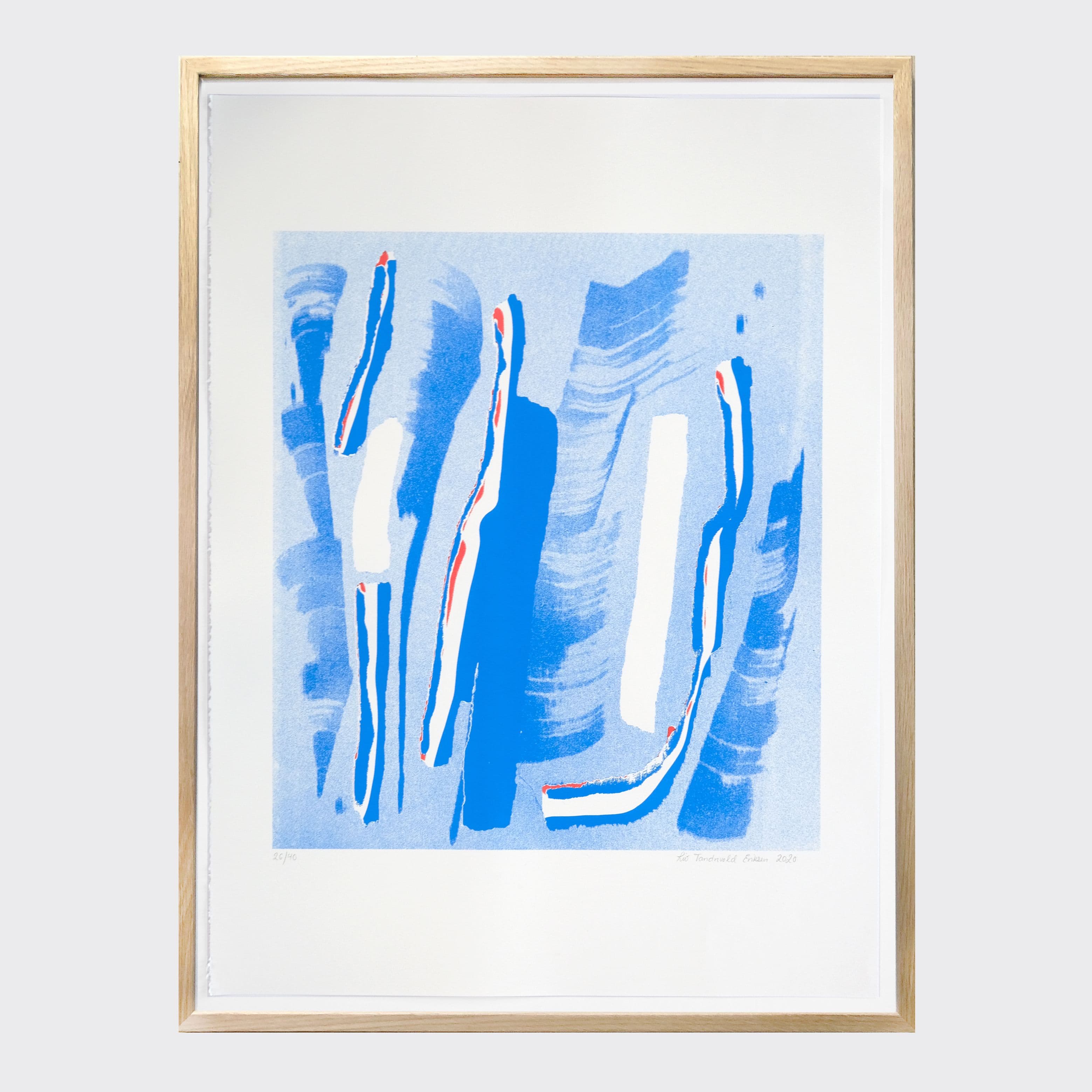 - Jeg ønsket at motivet skulle ha en likhet til maleriene mine, men med kvalitetene til et silketrykk. Derfor lagde jeg rett og slett et maleri først og jobbet det frem slik jeg pleier å gjøre når jeg lager et maleri. Silketrykket består av forskjellige typer strøk men med kun to farger. Motivet er abstrakt, men strøkene blir nesten figurative i oversettelsen fra maleri til silketrykk.