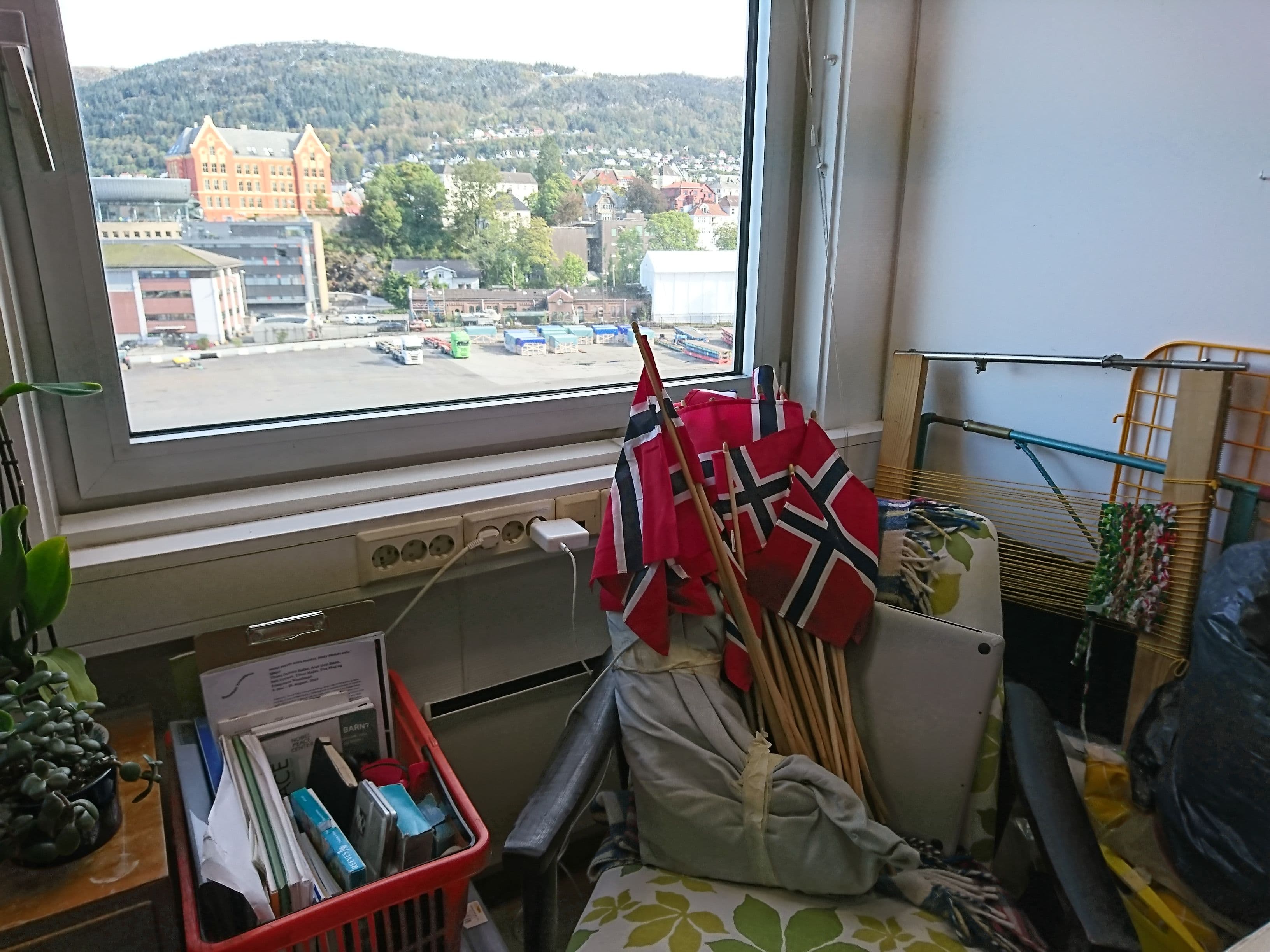 - Atelieret mitt er på ca 12 kvm. Jeg har utsikt mot Fløyen og kontainerhavnen, hvor det visuelle landskapet er i kontinuerlig endring. Foran vinduet har jeg et tegnebord arvet fra faren til en gammel flamme. Ved siden av godstolen har jeg et langt arbeidsbord hvor flere tanker og prosjekter kan jobbes med samtidig. Jeg har arvet to store kork-tavler fra min gode venn og kunstnerkollega Kiyoshi Yamamoto som aktivt brukes for å holder «orden» på allslags inputs. Jeg har bøker, utstyr og litt for mye materialer etter år med «hamstring».